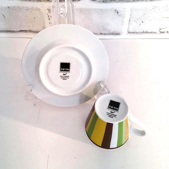 Charming set of espresso demitasse cups and matching saucers. 222 Fifth 'Nina' collection set. Each porcelain cup features bold stripes in a unique colorway—yellow, green, red, purple, and blue—paired with coordinating saucers. Rare Collectible Pattern.